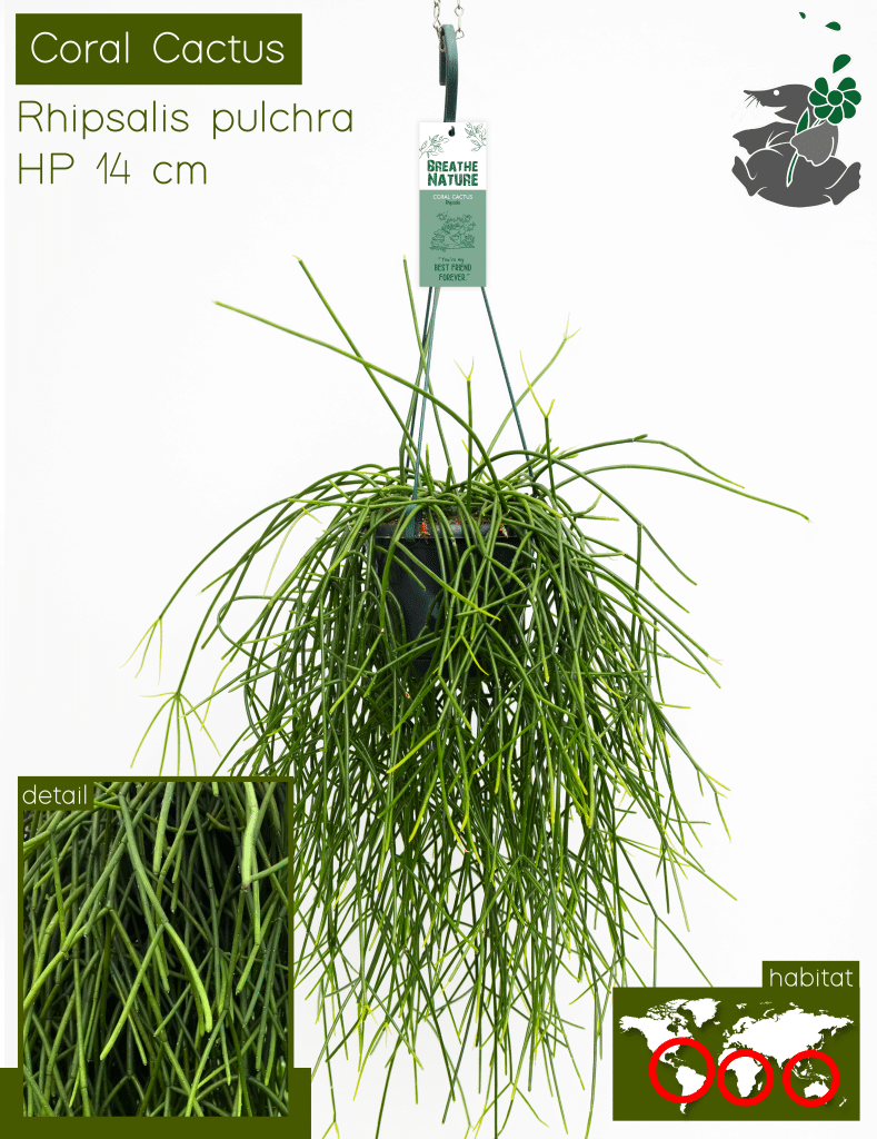 De Rhipsalis pulchra wordt soms ook wel de “Coral Cactus” genoemd, vanwege haar hangende, vertakte takken die doen denken aan koraalriffen. Deze plant heeft zowel een speelse, tropische uitstraling als een uniek, slingerend karakter. Oorspronkelijk komt ze uit de tropische regenwouden van Zuid-Amerika, waar ze zich heerlijk voelt in de schaduwrijke, vochtige omgeving.